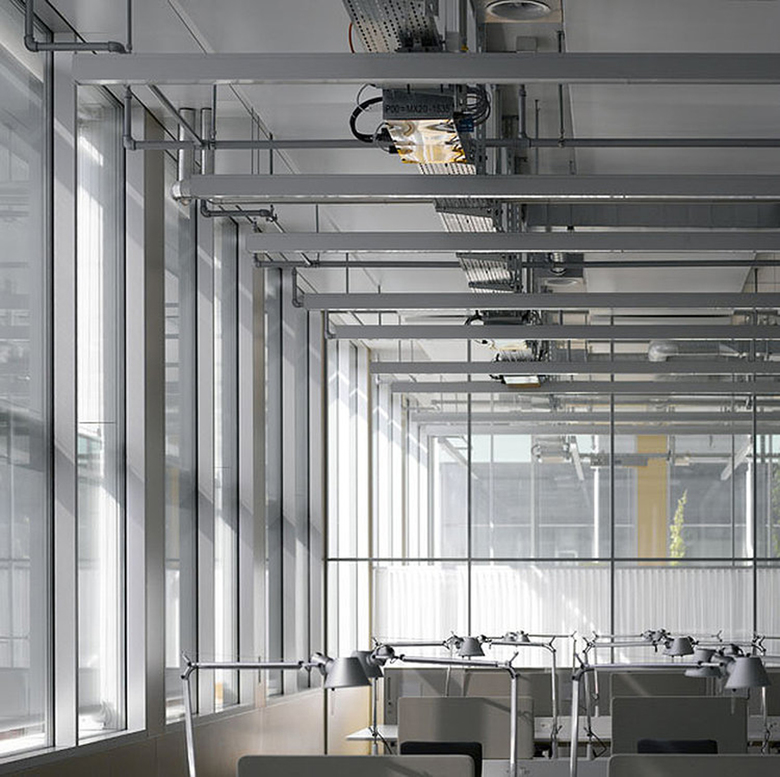 Auf die Mitten der Fassadenelemente orientiert können sowohl komplexe Einrichtung der Labormöblierung wie auch die grosszügigen Open-Space Büroflächen mit einfachsten Linien zu einem architektonischen Thema zusammengefasst werden. Die Lichtlinien beginnen und enden exakt auf architektonischen Gegebenheiten und sind untereinander in ein ganzheitliches Gefüge eingepasst.