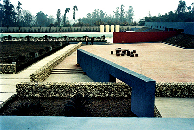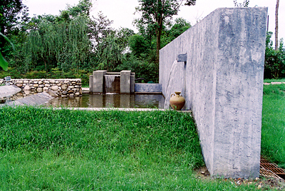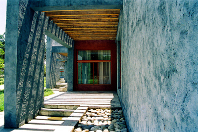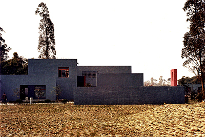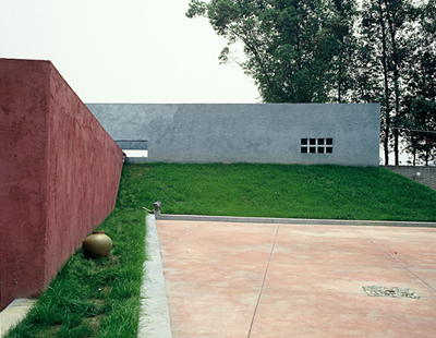 The most important part of the camp is the architectural expression by the walls. Wall is the most essential architectural element, the permanent theme of Chinese architectural culture, as well as the product of brick structure, the cheapest, easiest and most popular construction. The architecture adopts brick structure with deliberately repeated linear walls, emphasizing a sense of straightforwardness and bricklaying composition. Walls largely painted in blue gray with red gray segments in between, are taken from familiar local buildings, which are built with red and gray bricks, and are refined for an abstract and dramatic expression. They stand out of the green environment, under the gray sky, harmonizing the architecture with the heaven and the earth. The long and low cobble wall is made of local materials, inserted into the green. Compared with the long solid wall, the cobble wall is an expressive vernacular. Sand, wood, stone and iron are used as material. All these materials adopt rough skills such as the roughcast plaster on the wall. I choose this kind of material and skills somewhat deliberately to exhibit the trace of handwork. On the other hand it’s a preventive treatment according to investment and construction skills to make the complete architecture not so fragile.
