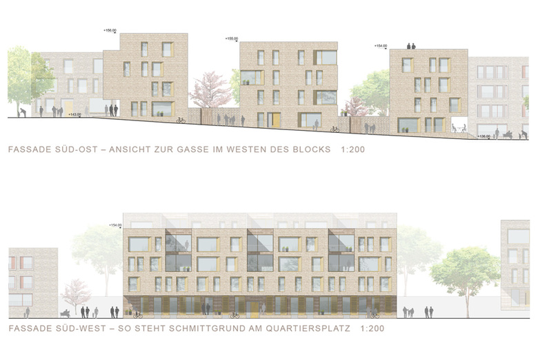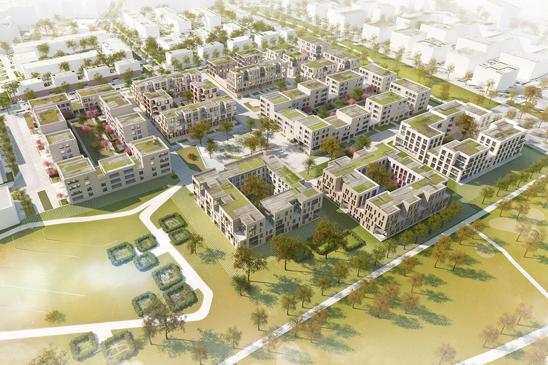 The winning urban concept creates both compactness and diversity, while responding to the topography of the site and highlighting the relation to green space as a central concept. Eight differently sized blocks are positioned in a village-like setting around squares, playgrounds, meadows or meeting places. The inner courtyards and the outdoor spaces around the buildings vary in both size and level of privacy. On three locations public open spaces offer meeting areas in the neighbourhood. The central square is strategically positioned to offer views looking over the skyline of Frankfurt. A fine network of paths following the principle of the “open city” connects the quarter to its surroundings.