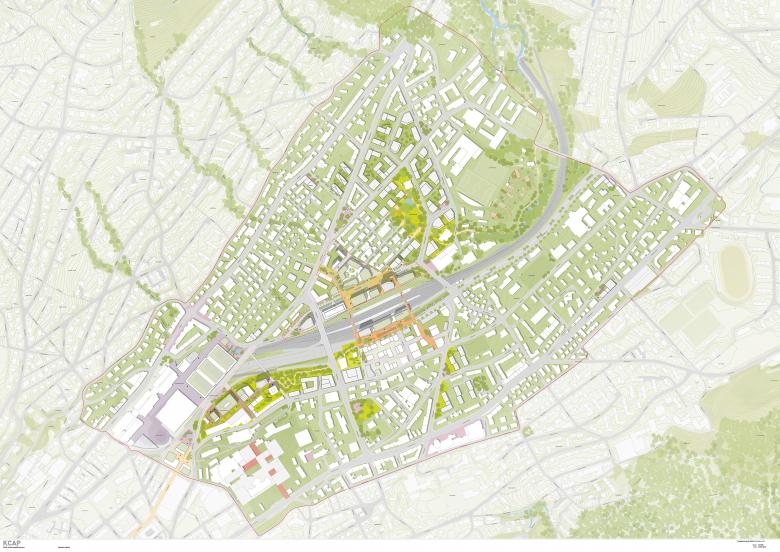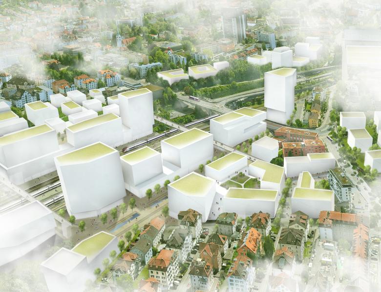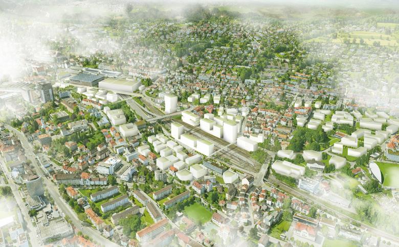 With the open-space and landscape concept and an additional pedestrian bridge over the track field, the cross-references and connections existing today are strengthened and integrated into the layout of the new city center through strategic use of the available space and potential of Gerhalden and Tanneichbach.