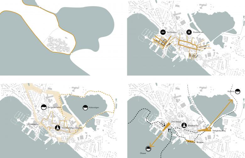 Faaborg was originally located on a peninsula, lost over time by being filled or covered, becoming very unclear. In the competition proposal, the landscape is restored, turning the Sundrännan culvert back into an open channel with new hiking trails leading up to the surrounding hills, recreating the natural character of a peninsula. The connection becomes even stronger in the design of three new public spaces – Kulturparken, Bryggan and Öhavstorget. The new urban fabric is formed clearly by taking the existing structure into direct consideration as well as by a careful approach to areas where fabrics from different times meet.