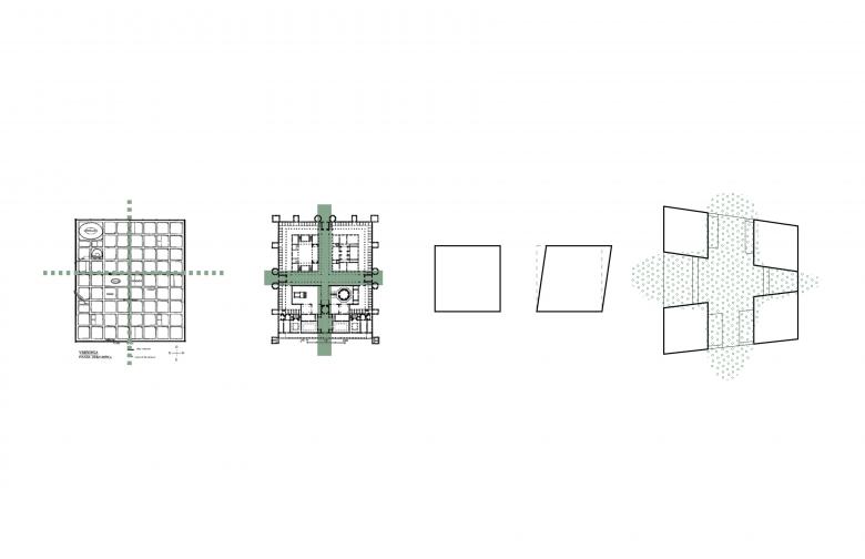 The layout is based on a classical urban typology dating back to Ancient Rome, defined by two intersecting axes. Applying such composition to Ribosomen has resulted in uninterrupted sightlines and strong movement flows, opening the block towards the surrounding urban fabric and generating new qualities.