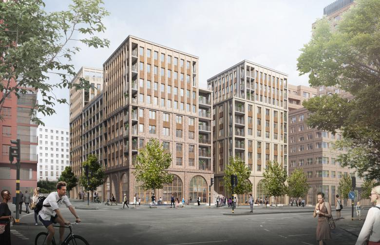 The new plans City of Stockholm has developed for Norrtull and the eastern Hagastaden entail that Stockholm will acquire a new northern entrance to the inner city, provided with a new school, sports facilities, student and elderly housing, a hotel and a new square, as well as many more amenities. Previously characterized by unused land and an abundance of infrastructure, Hagastaden’s transformation into an inner-city district where Stockholm and Solna meet is scheduled to be finished in 2030. The main objective of the council is to remove present barriers and facilitate free movement between neighbourhoods through a dense, vibrant urban environment with connections to the Royal National City Park. Ribosomen, located within the new detailed development plan for eastern Hagastaden, is a new residential scheme, inspired by the classical 19th century urban typology and the iconic brick architecture of Vasastan, designed by architects such as Cyrillus Johansson, Ragnar Östberg and Edvard Bernhard. The project is being developed by Kjellander Sjöberg and Humlegården after winning a competition for the site.