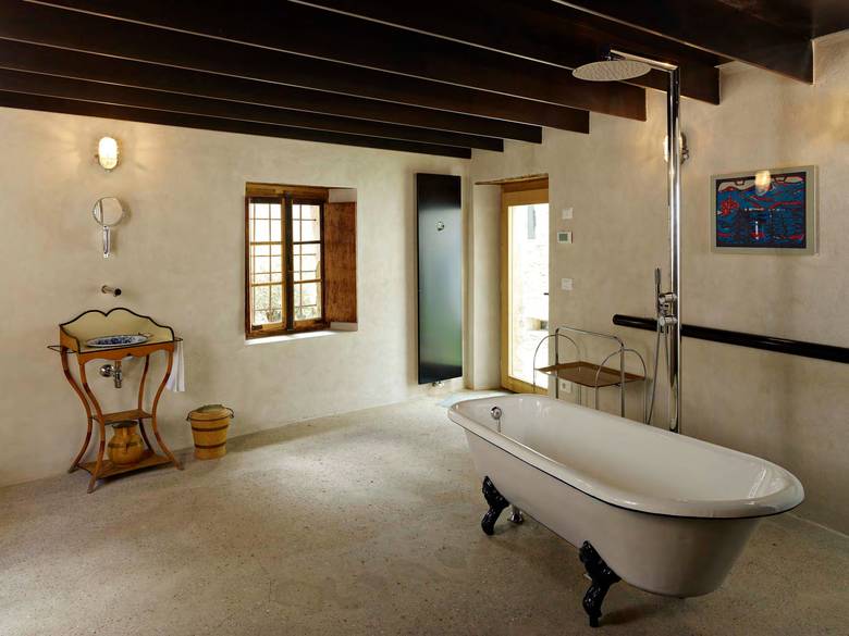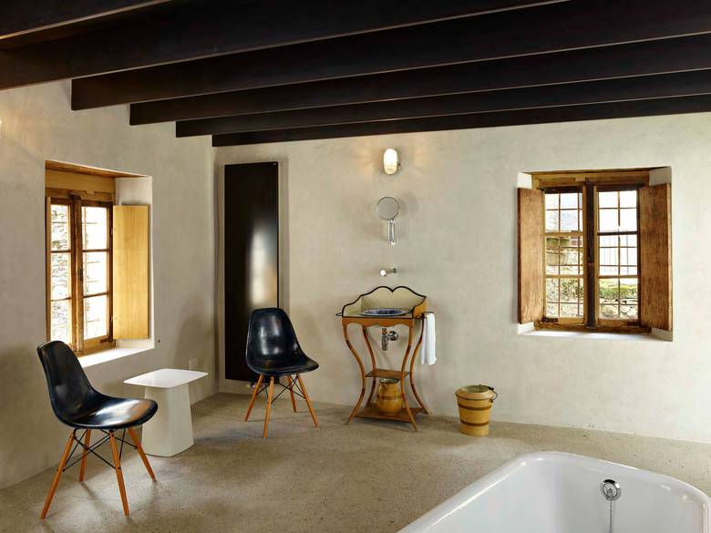 Im ersten Stock lädt ein grosszügiges Badezimmer mit einem Boden aus geschliffenem Beton zum Verweilen ein. Die Badewanne und das Waschbecken sind Retrouvalien, welche restauriert und freistehend im Raum platziert wurden.