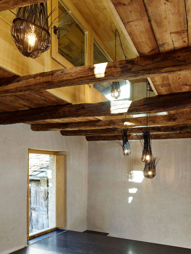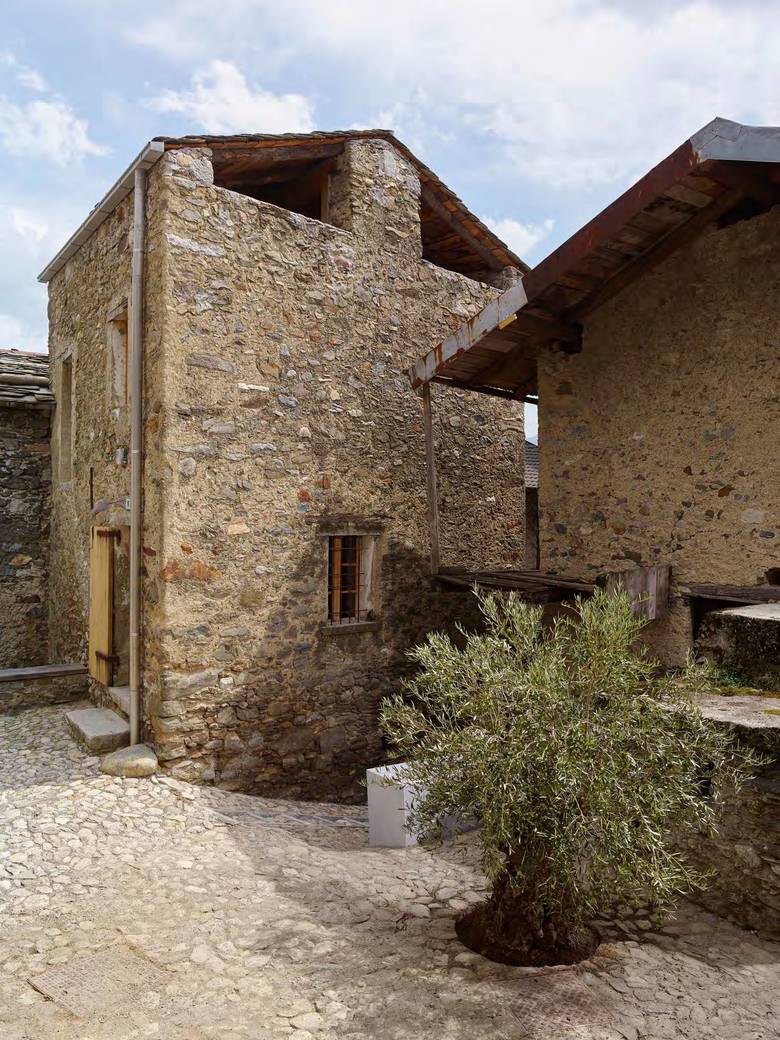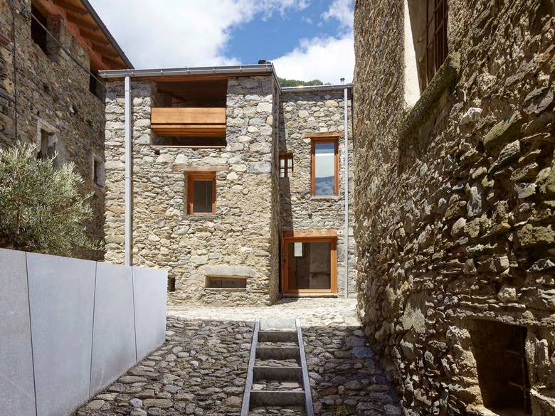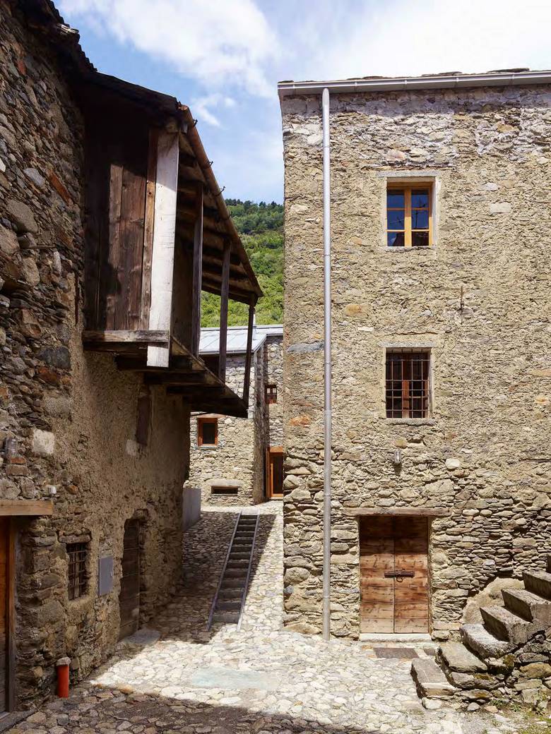 Eine spezielle Dachkonstruktion erlaubt ein für die Region typisches, nicht isoliertes Steindach mit Öffnungen in den seitlichen Fassaden. Unter dem traditionellen Satteldach verbirgt sich ein isoliertes Flachdach. Von dessen Mitte aus erhebt sich beidseitig eine Fensterfront, welche das Obergeschoss mit indirektem, natürlichem Licht flutet. Alle bestehenden Fenster und Innenfensterläden wurden repariert oder, falls nicht mehr vorhanden, durch neue aus Kastanienholz ersetzt.