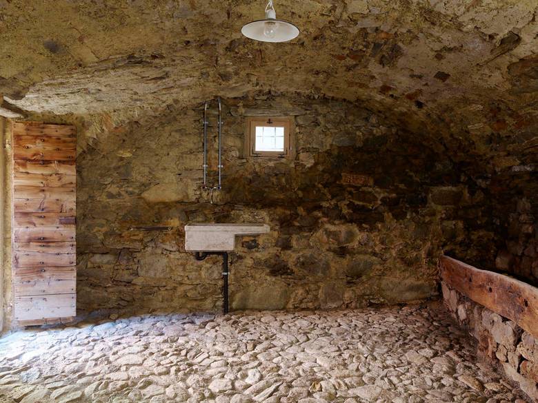 Der frühere Stall wird nicht mehr für Tiere genutzt, trotzdem bleibt der Trog erhalten. Auf der gegenüberliegenden Seite ist nur noch ein Stück Mauer vom Trog übrig, welche mit einem Kastanienholzbrett versehen nun als Bank dient.