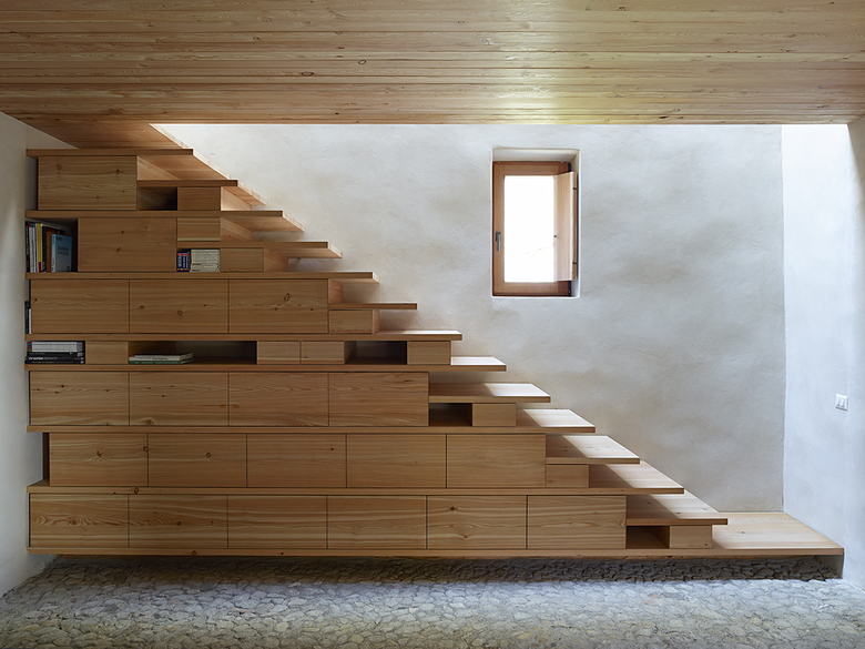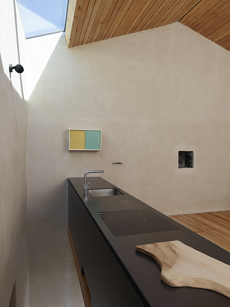 Das Haus war bis auf die Aussenwände komplett verfallen. Im Inneren wuchsen Pflanzen und Bäume. Die Aussenwände samt deren Öffnungen wurden erhalten und wo nötig ausgebessert. Die Dach- konstruktion besteht aus massiven Lärchenholzbalken und wurde mit Uginox eingedeckt. An der Nordseite wurde ein Oblicht eingebaut, welches das Obergeschoss und die Treppe mit natürlichem Licht beleuchtet.Im Innern entstanden drei Räume, es sind dies ein Schlafzimmer mit angrenzendem Badezimmer im Erdgeschoss und eine Wohnküche im Ersten bzw. im Dachgeschoss mit direkt angrenzender Loggia. Die Dach- sowie die Geschossdecken bestehen aus massiven Lärchenholzbalken. Als Brüstung der Loggia dienen Bänke, welche in die Öffnungen eingebaut wurden. Ebenfalls wurde ein Grill in die Hausmauer eingelassen, der somit die Loggia vollendet. Im Schlafzimmer wurden Pflastersteine verlegt, so enstand ein fliessender Übergang zur Umgebung des Hauses, welche ebenfalls mit Pflaster versehen wurde. An der Nordfassade wurde ein monolithischer Steinblock hingestellt, welcher als Bank dient. Die Wände der Wohnräume wurden mit Grassello, einem Kalkverputz, versehen. Die Wand im Badezimmer besteht aus einem abwaschbaren Spezialverputz. Die Badewanne ist im Boden des Badezimmers versenkt und besteht aus massiven Steinplatten, wie auch der Boden selbst. Die Treppe, welche die beiden Geschosse verbindet besteht aus massiven Lärchenholz und dient gleichzeitig als Schrank für das Schlafzimmer.