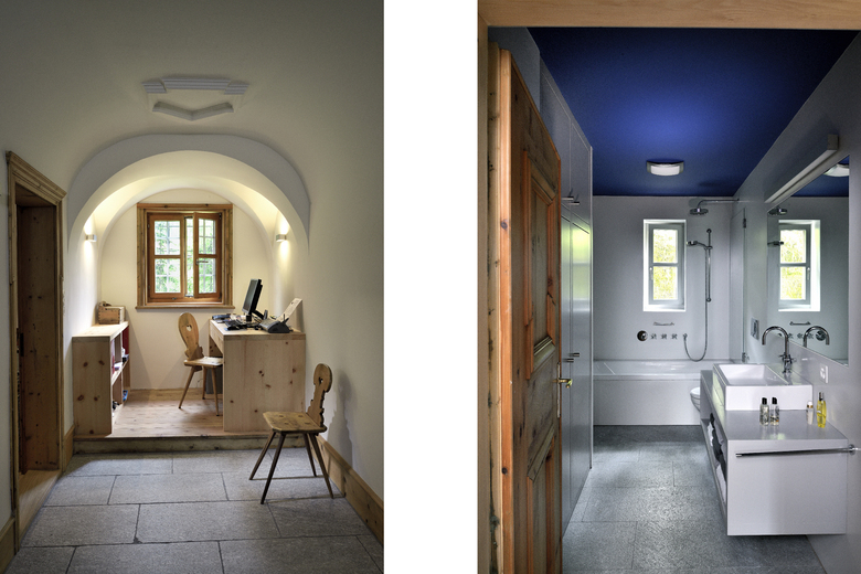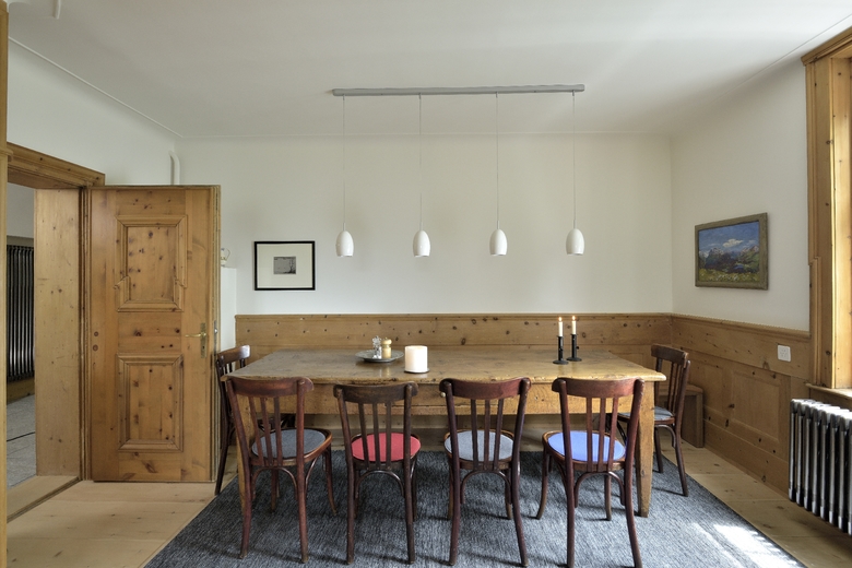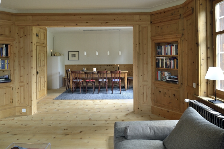 Die Erdgeschosswohnung der Heimatstil-Villa wurde durch ein paar Eingriffe sowie das Entfernen der Sünden aus den 80er Jahren sanft saniert. Die Höhe der Räume, Stuck und Arven-Täfer sind original erhalten. Küche, Bäder und Bodenbeläge sind grösstenteils erneuert worden. Durch neue Fenster im Wintergarten wurde dieser Bewohnbar gemacht.