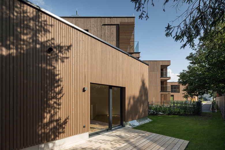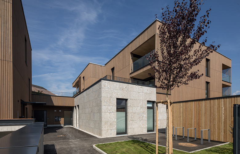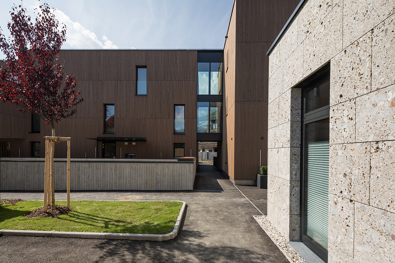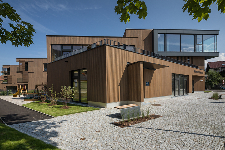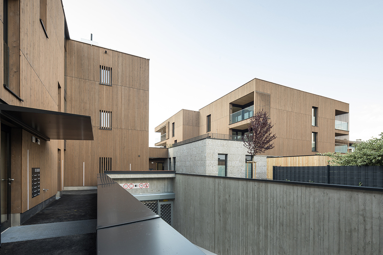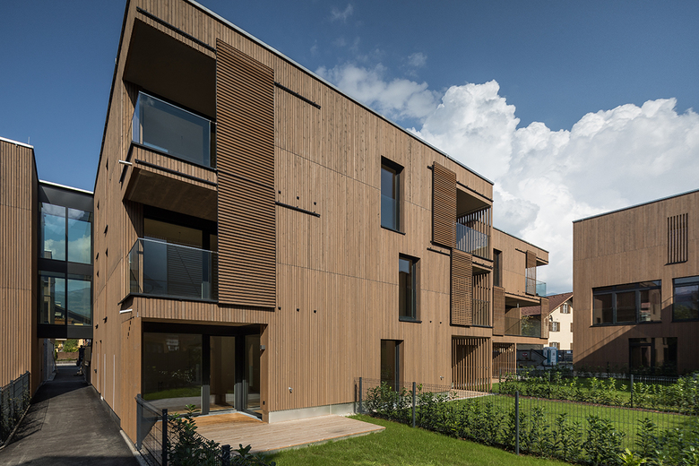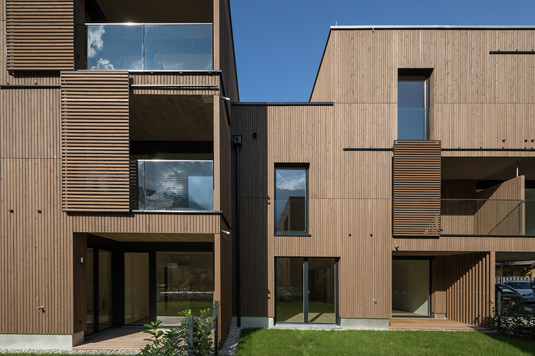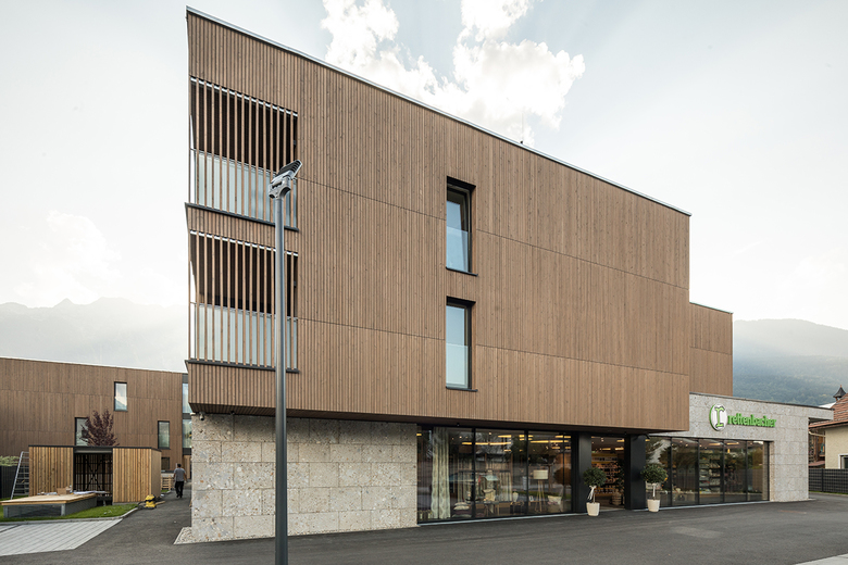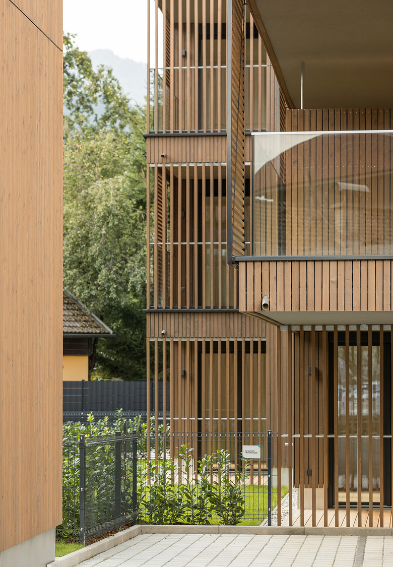 Kuchl ist bekannt als energiebewusste Gemeinde, mit einem sehr starken Bezug zum Holzbau. Bis auf das massive Sockelgeschoss beim Gewerbe wurden die Baukörper in Holzbauweise errichtet und nur auf Grund schallschutztechnischer Maßnahmen wurden Teile massiv ausgeführt. Alle Baukörper wurden einheitlich mit einer vorgesetzten Holzfassade mit vertikaler Lattung versehen. Loggienseiten wirken durch eine offenere Lattung luftiger und auch der Sonnenschutz in Form von Schiebeelementen mit einer horizontalen Holzlattung sind Teil des homogenen Fassadenbildes.