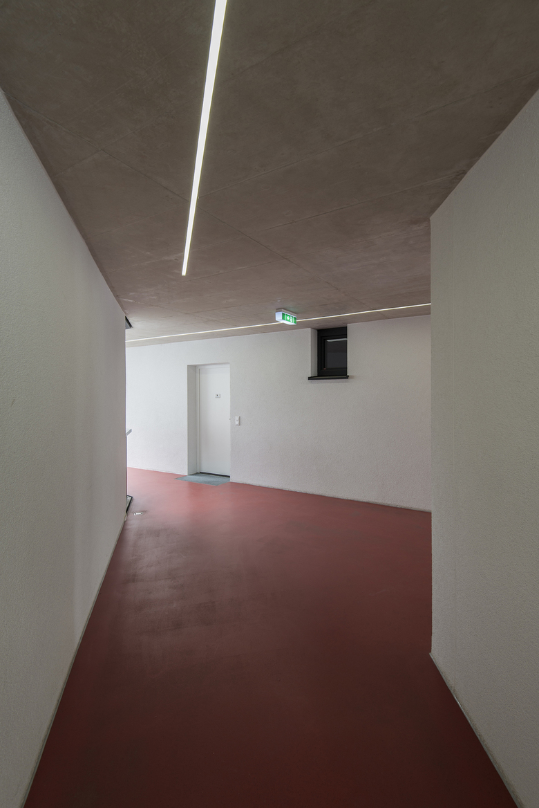 Die Durchwegung der Anlage gründet von der Idee, einen durchgehenden ‚Baumkronenweg‘-artigen Laubengang nachzuempfinden, um eine attraktive Erschließung anzubieten. Dabei schlängeln sich die Wege wie ein roter Faden (rot eingefärbte Epoxybeschichtung) durch die Anlage. Die 9er Gruppe wird einheitlich in einer weißen Vollwärmeschutzfassade ausgeführt, in starkem Kontrast dazu die schwarzen Brüstungen der Laubengänge.
