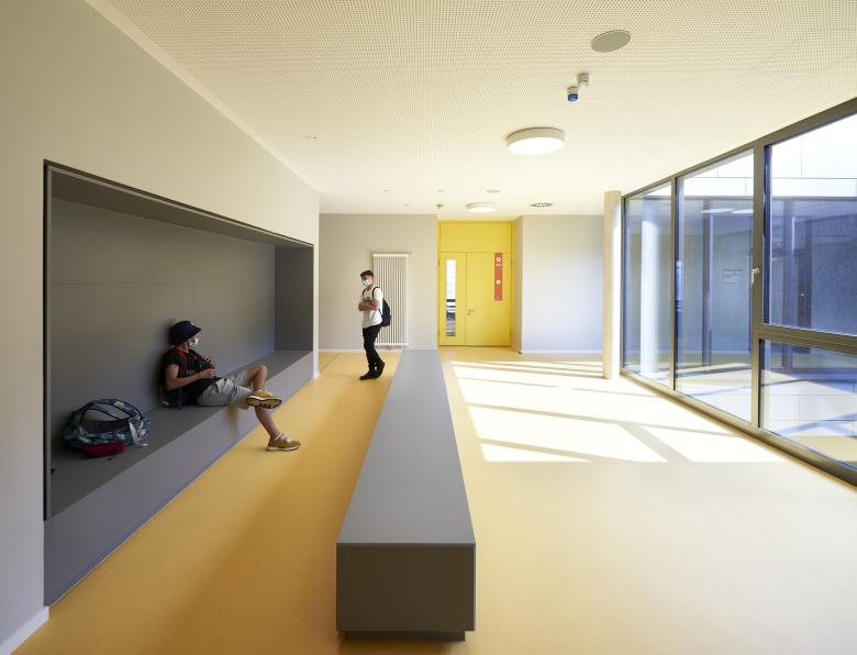 Bei der Planung wurde Wert daraufgelegt, dass alle Räume barrierefrei zu erschließen sind, dass in den Klassenräumen ein gesundes Klima herrscht und ausreichend Licht einfallen kann. Freuen können sich die SchülerInnen auch über zusätzliche Rückzugsorte und Arbeitsplätze neben den üblichen Klassenräumen: Im Bestandsgebäude bietet dafür die Galerie und im Erweiterungsgebäude die Flurzone eine multifunktional nutzbare Fläche.