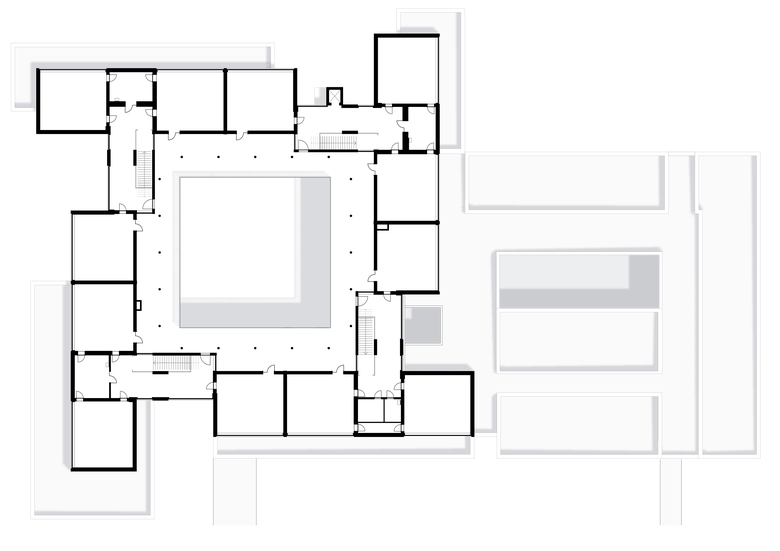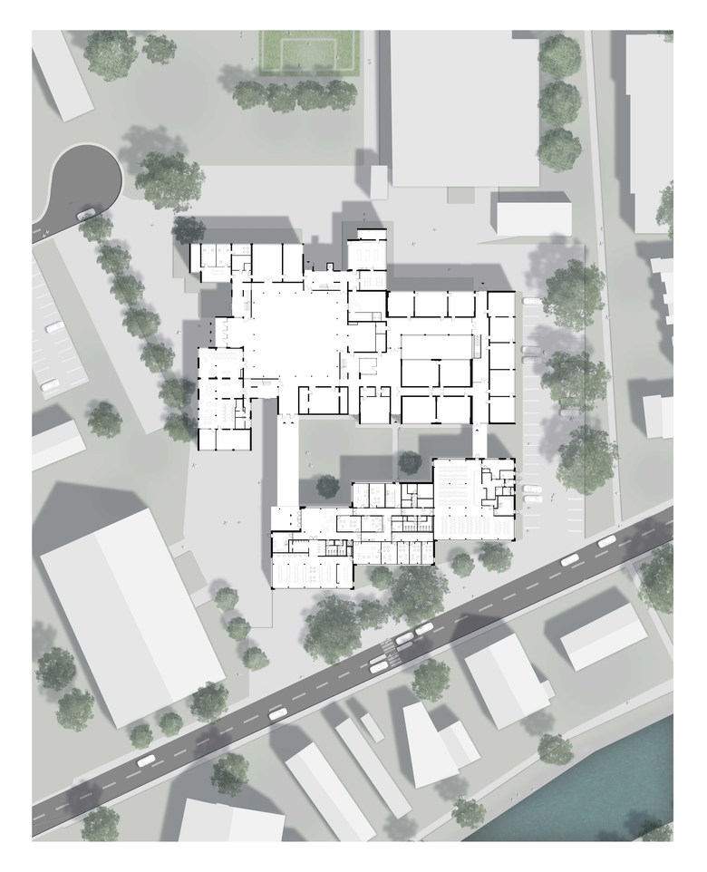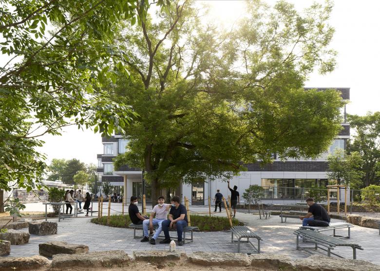 Aufgrund der Lage des Erweiterungsgebäudes entsteht zwischen den beiden Gebäuden und der bestehenden Sporthalle ein zentraler Innenhof, der als Schulcampus oder pädagogischer Außenbereich genutzt werden kann. Ein zusätzlicher Stellplatz für Autos rundet die Erweiterung ab.