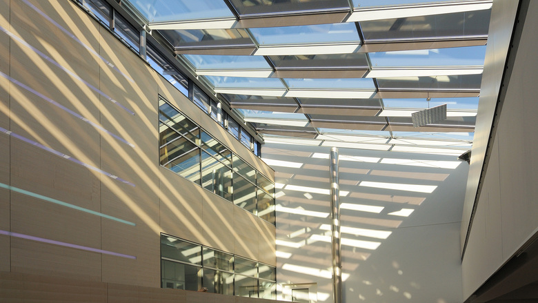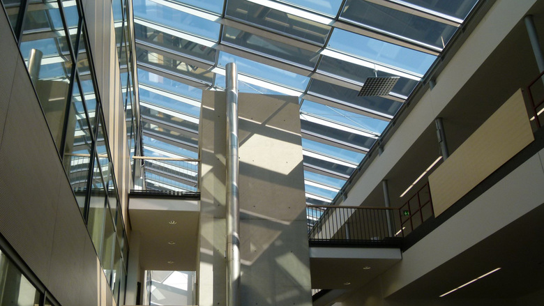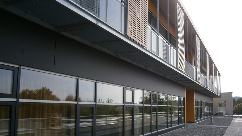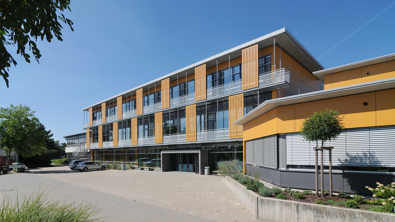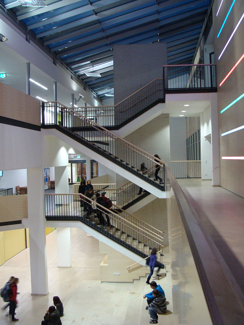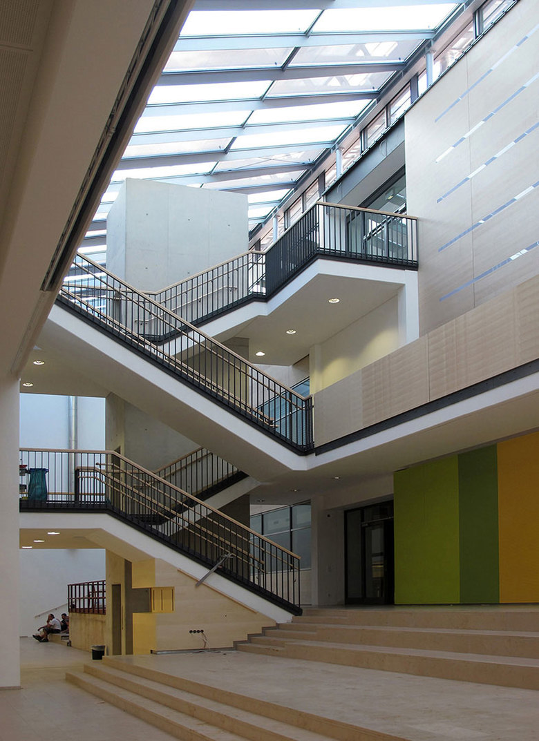 Generalsanierung und Aufstockung einer 4-zügigen, sechsstufigen Realschule in Ansbach in Holz- und Niedrigenergiebauweise mit dem Ziel Passivhausstandard. Durch die Aufstockung entsteht aus dem vorhandenen Lichthof eine große 3-geschossige zentrale Halle. Die Aufstockung stärkt das klare Erschließungskonzept des Bestands und bindet das Neubauvolumen zentral mit kurzen Wegen ein. Es entstehen wenig zusätzliche Hüllflächen, wodurch konzeptionell eine energiesparende Bauweise realisiert wird. Die Erweiterung auf dem Dach wird in Holzbauweise erstellt, um die Auflast gering zu halten und die Bauzeit durch einen hohen Vorfertigungsgrad zu reduzieren. Insgesamt bekommt der Bau eine ca. 24 cm starke, gedämmte Gebäudehülle. Erneuerbare Energien werden mittels Erdkollektoren für die Heizung, Luftkollektor für die kontrollierte Be- und Entlüftung mit Wärmerückgewinnung und mit integrierten Photovoltaikelementen genutzt. Die kontrollierte Belüftung aller Räume sorgt durch den geregelten Luftwechsel, neben der Energieeinsparung, auch für ein gesundes Raumklima.