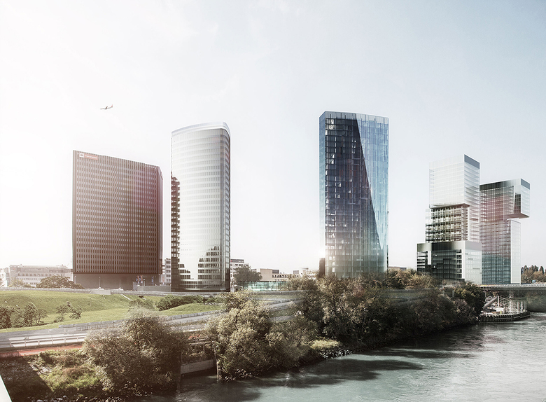 Der Turm reiht sich in das Ensemble der umgebenden Hochhäuser ein. Die Kubatur schließt das Quartier nach Süden hin ab.