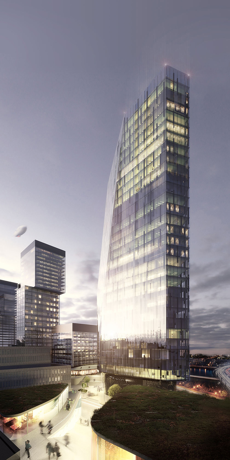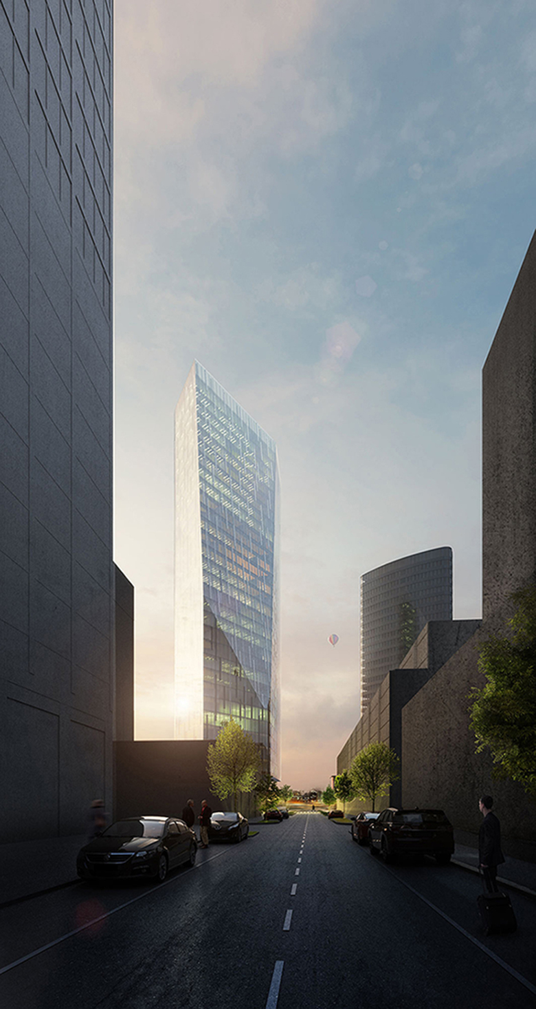 Die Hochhaustypologie entspricht einem multifunktionalem Sockel und einem monofunktionalen Turm. Das Sockelgebäude incl. Vorplatz erstreckt sich terrassenförmig über das gesamte Grundstück.