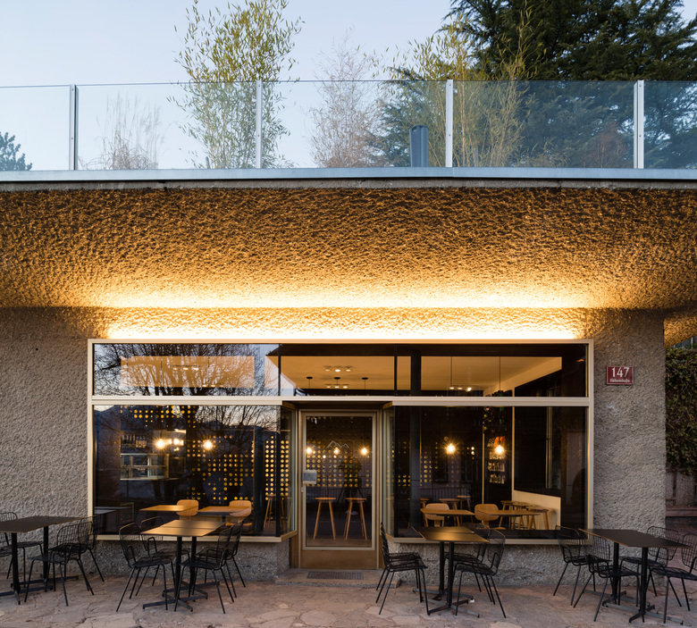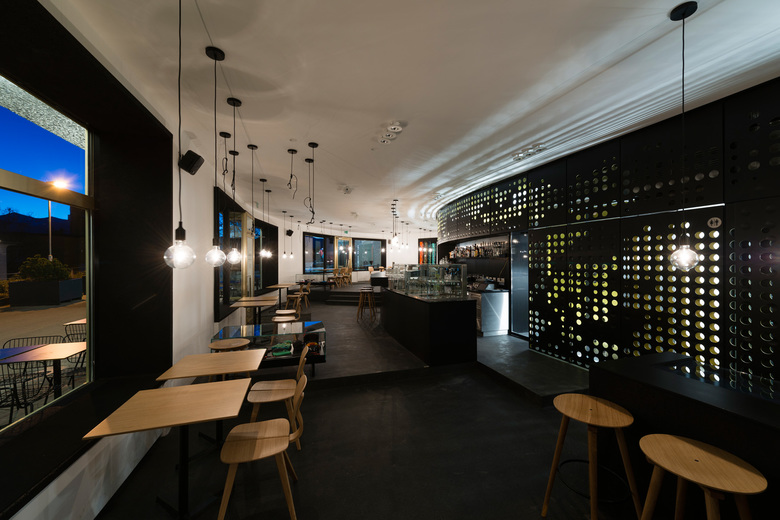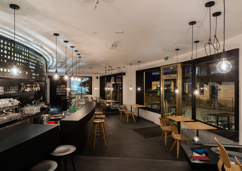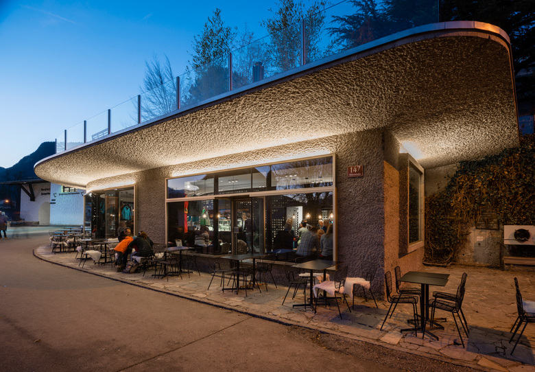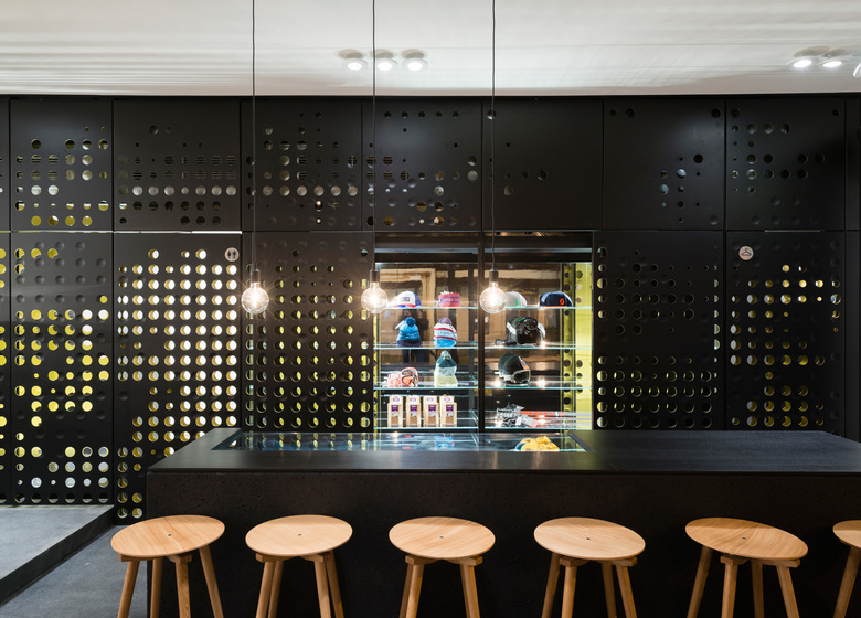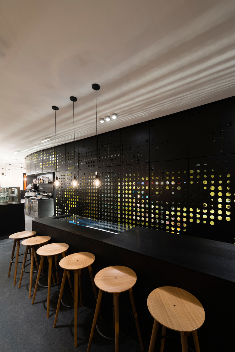 Für die Architektur eine interessante und anspruchsvolle Herausforderung zumal es die Grenzen zwischen Lokal und Shop zu überwinden galt. Grundlegend für das Gestaltungskonzept war es im Spannungsfeld zwischen Hungerburgbahn und Nordkettenbahn - Tiroler Moderne und Avantgarde, unter Bezugnahme auf die Material- und Gestaltungsästhetik der 60er Jahre, die Essenz des ursprünglichen Gebäudeentwurfes wieder herzustellen und im Innenraum erlebbar zu machen.