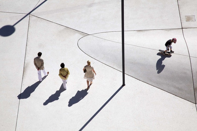 Tagsüber stehen neben Bäumen und Personen vor allem die Denkmäler im Vordergrund: Auf der großzügig weiten Topographie wandern deren kontrastreiche Schatten über den Platz.