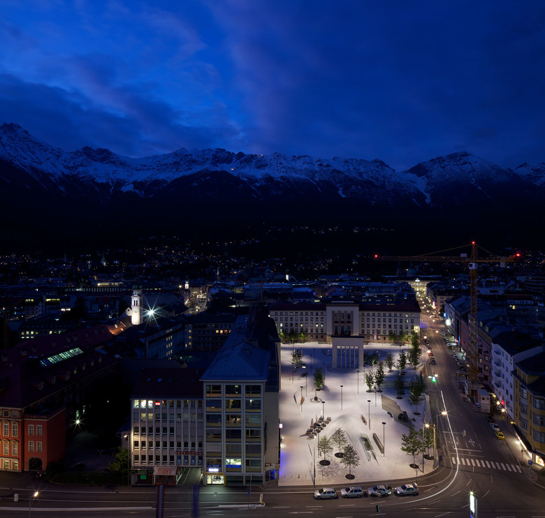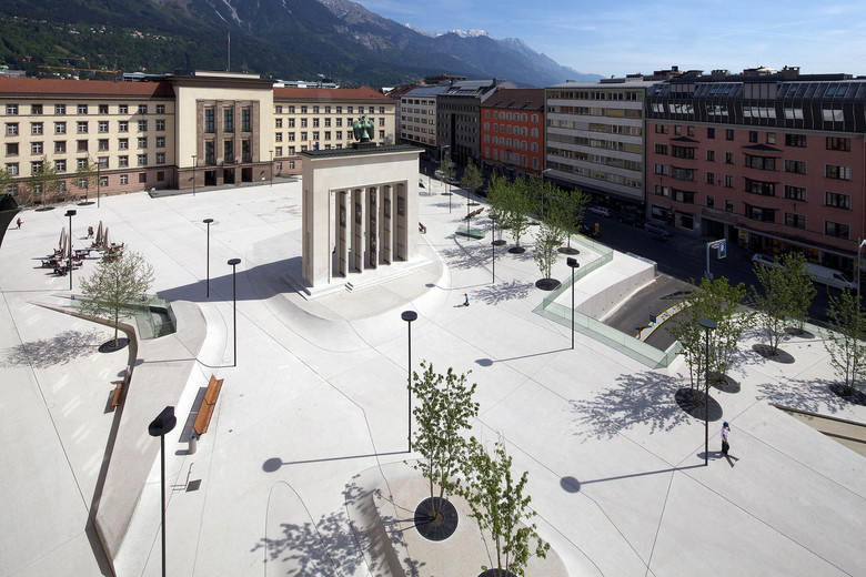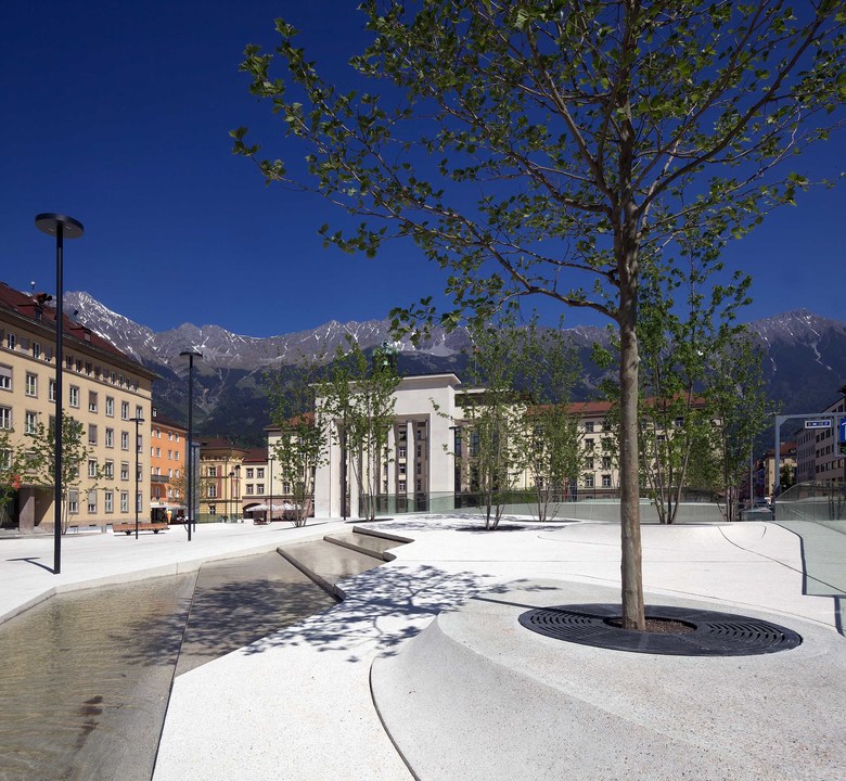 Der historisch junge Eduard-Wallnöfer-Platz mit seinen vier Denkmälern präsentierte sich über viele Jahre als Zwischenraum, Leerstelle, Platzhalter – ein Nebenschauplatz im Zentrum der Stadt. Seine symbolische Bedeutung hat er indes beibehalten. Passanten, Nutzer und Denkmäler sind die Protagonisten auf dem neu gestalteten Landhausplatz. Sie lassen ihn zu einem übergeordneten öffentlichen und offenen Forum zwischen Hauptbahnhof und Maria-Theresien-Straße werden.