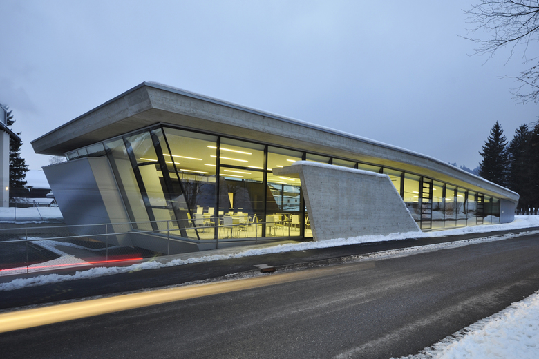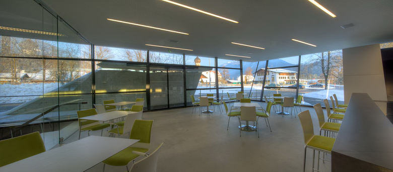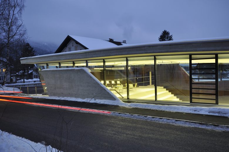 Der Mehrzwecksaal Weißenbach ist ein langgestreckter und transparenter sanft nach Süden ansteigender Baukörper.