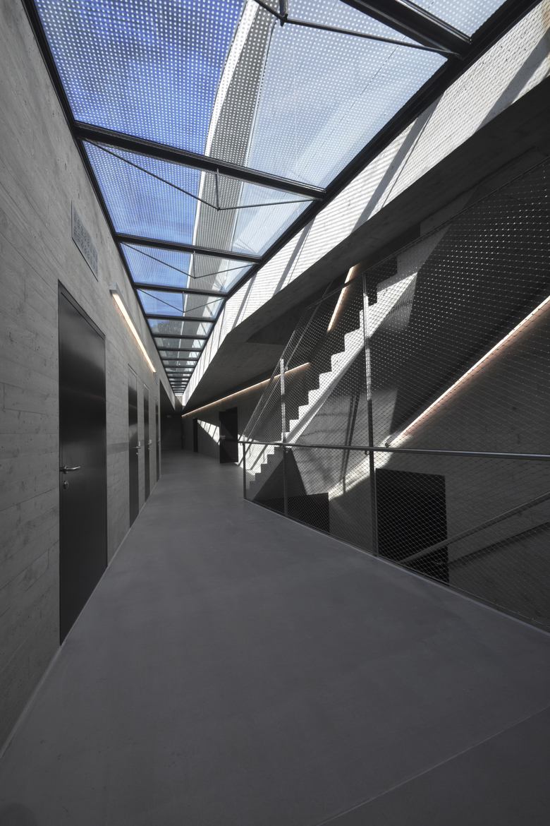 Das Gebäude wird geprägt durch die vertikale Durchdringung der Räumlichkeiten und deren vielseitige Erschließung.