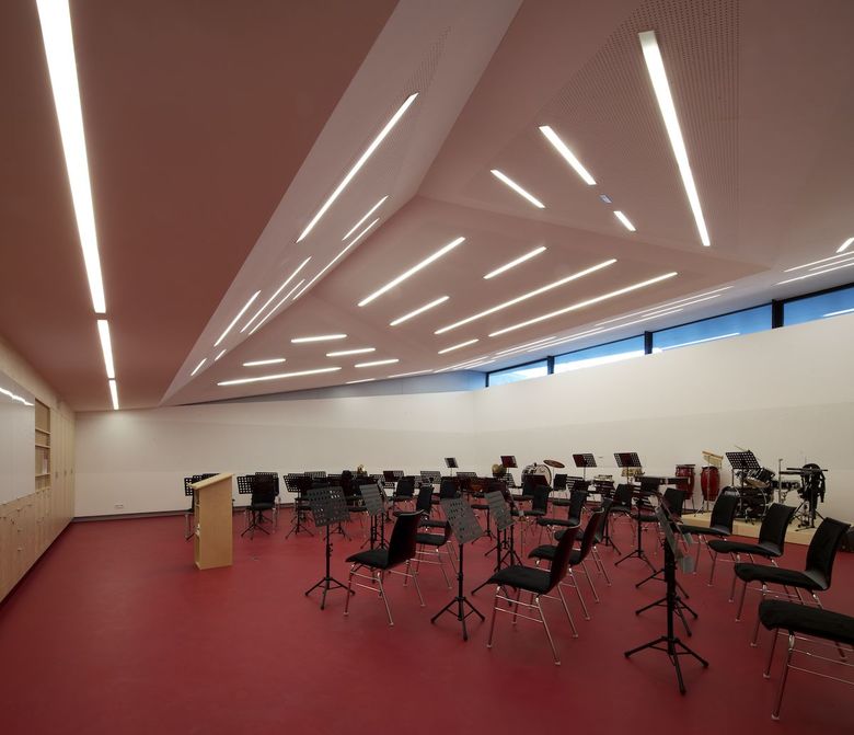 Eine Tribüne erweitert den Mehrzwecksaal in Richtung Café und bildet somit einen fließenden Zuschauerraum für Veranstaltungen. Das Probelokal bringt das darüber liegende Café zum Schweben.