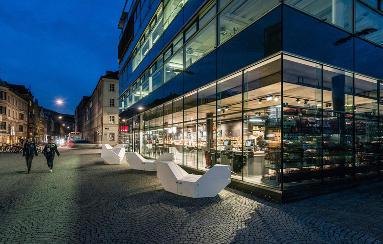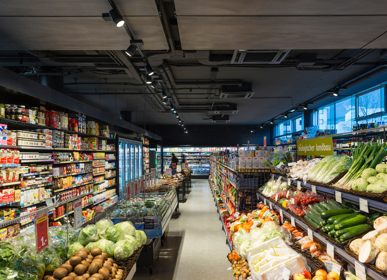 Für die umgbenden Institutionen Universität, und Schulen wird das Gastronomieangebot durch den kleinen Lebensmittelmarkt im Sinne der Selbstversorgung ergänzt. Frische Produkte, Obst, Salat und Gemüse werden auf Materialien präsentiert, welche als hochwertiger Streetstyle wahrgenommen werden kann.