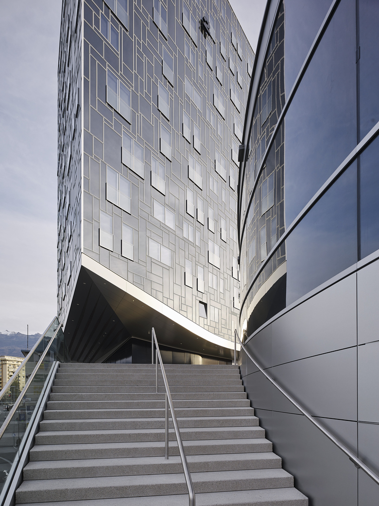 In unmittelbarer Umgebung zum Bahnhof und am Kreuzungspunkt von drei Stadteilen soll das hybride Gebäude Identifikationspunkt für bestehende und Weichenstellung zukünftiger Stadtteile sein. Stadträumlich folgt die Bibliotheksfassade konsequent der Flucht der Amraserstraße in den Stadtteil Pradl und stärkt diese in ihrer Funktion als Hauptverkehrsachse. Sowohl die Positionierung als auch die Nord - Süd Ausrichtung des Turms mit vorwiegend Wohnnutzung garantieren die für die Stadt charakteristischen Sichtbeziehungen in Richtung Mittelgebirge und Nordkette.