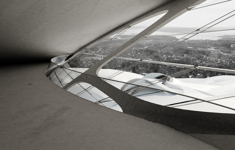 The main construction principle is to be a fully cantilevered tower in reinforced concrete utilising prestressed cables in the tension zone. The proposed integrated windshield is used as a structural element and helps minimize deformations in terms of bending, torsion, and twistbuckling. The knoll building is to be built on elastic foundation points. The construction of the tower will be carried out using free climbing formwork and avoids the use of scaffolding. The section of the tower which houses the cablecar will be the leading edge of the contruction with other structures of the tower following behind. Preliminarary calculations give a concrete wall thickness which diminishes with the height of the tower from 50 to 20 cm.