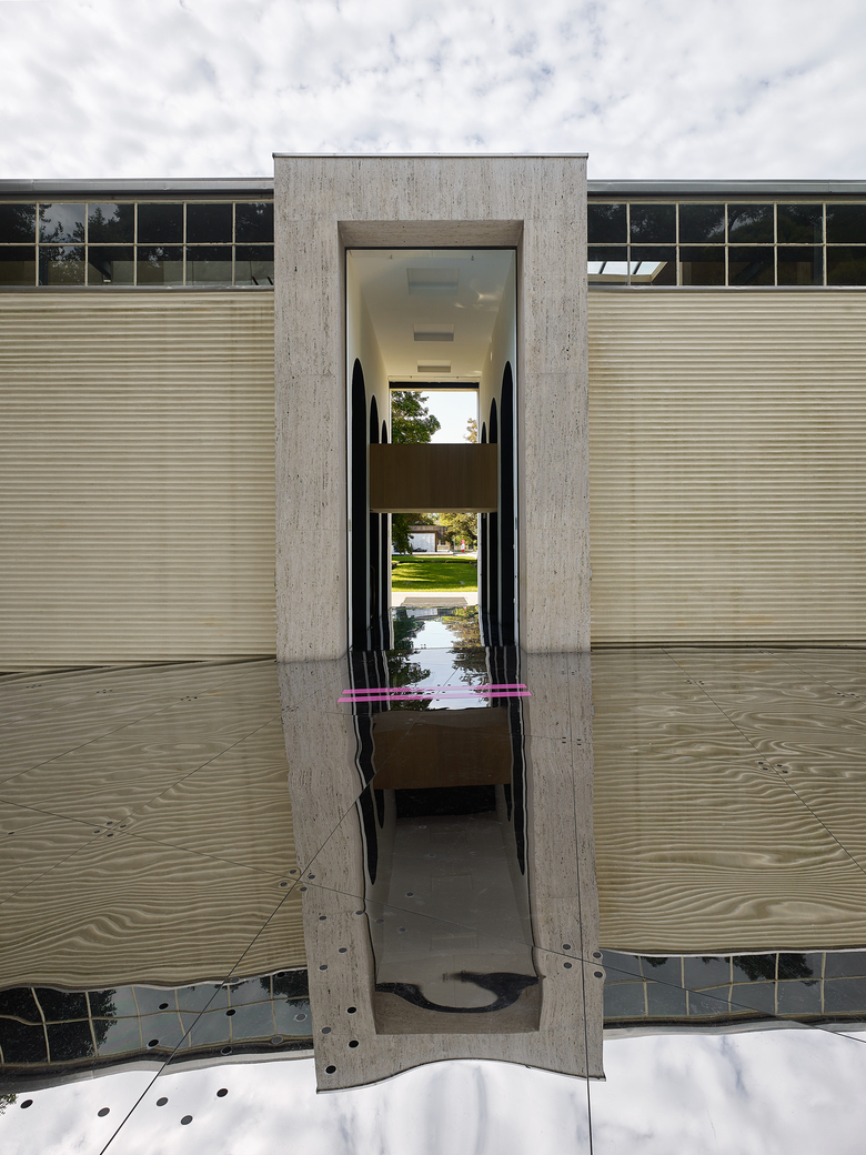 Sei es nun eine Folge der Anwendung des goldenen Schnitts im historischen Entwurf oder einfach purer Zufall, die Sphäre im Österreichischen Pavillon misst einen Radius von 128 Metern und steht im Verhältnis von 1:50.000 zur Erde. Die sichtbare, gekrümmte Fläche ist wie die Erde selbst ein Körper. Ein Boden-Körper, dessen verspiegelte Oberfläche von der Dualität des Raums erzählt und unser Verhältnis zur Erde hinterfragt. Sie veranschaulicht einen Raum, in dem man sich sieht, wo man nicht ist und vergegenwärtigt jenen Ort, an dem man sich befindet. Sie krümmt, verzerrt, transloziert und ermöglicht einen maßstäblichen Sprung, einen Sprung in ein Außen, in ein Außerhalb des Gegebenen und Vorstellbaren. So wird der Spiegel zum Instrument der Abweichung anstatt der Symmetrie. Symmetrie und Abweichung stehen einander wechselseitig gegenüber und erweitern die Räume des Pavillons.