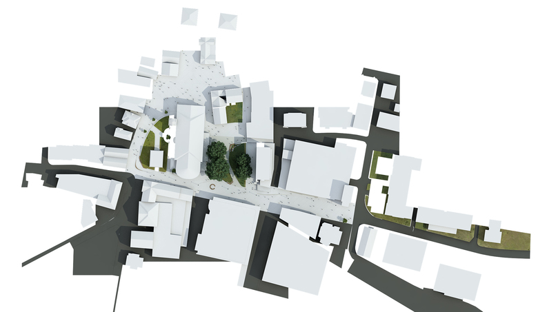 Pin 2 KIRCHPARK – Die Grünanlage im Kirchpark wird als topographische Anhöhe konzipiert. Sie verschafft einen Überblick über die Parkanlage und differenziert den Platz hinsichtlich seiner Anforderungen und Wegeführung. Die diagonale Achse – die Allee, sowie die untergeordneten Durchwegungen in den Randbereichen bleiben erhalten. Der Bodenbelag des Marktplatzes wird erweitert und schafft somit Raum für kleine, Veranstaltungen im Kirchpark. Die Atmosphäre des Kirchparks ist entspannt. Der zur Kirche geneigte Hang sollte die Qualität haben im Schatten der Bäume eine Pause zu machen. Durch die Anhöhe im Kirchpark entstehen neue, günstige Sichtbeziehungen:
