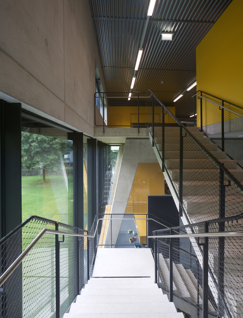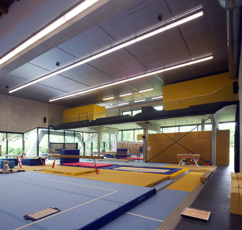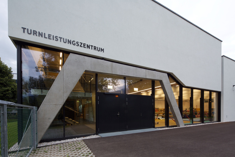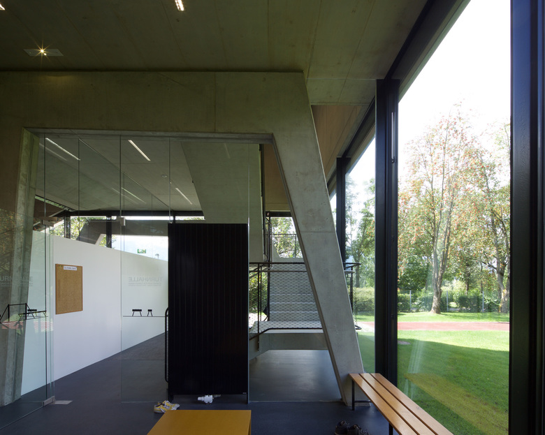 Der architektonische Fokus liegt auf dem gestaltgebenden Potenzial der auskragenden Tribünenkonstruktion. Einerseits wird dadurch die Ästhetik klassischer Sportbauten thematisiert, andererseits setzt das kompakte Obergeschoss die schlichte Haltung der Turnhalle fort und ermöglicht so das Wahrnehmen der Baukörper als Gesamtkomplex.