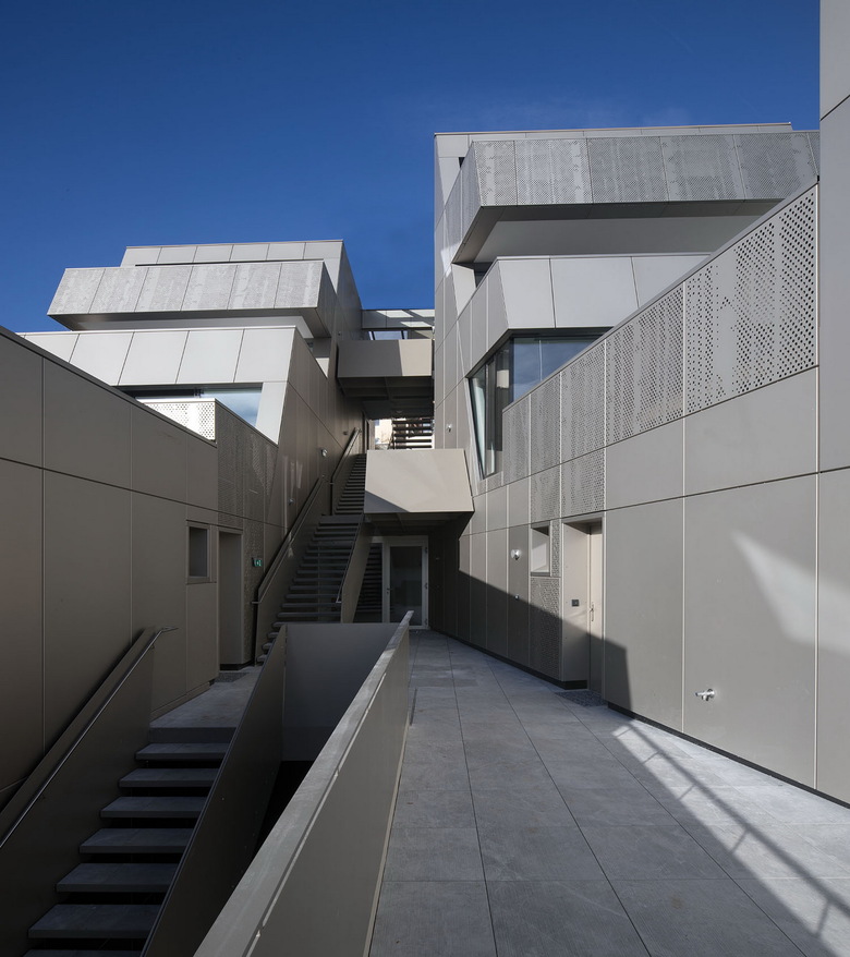 Die zentral liegende außenliegende Durchwegung unterstreicht die Gliederung der Bauteile und ermöglicht eine optimale Belichtung von mindestens drei Seiten.