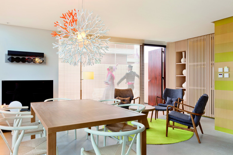 The walls of the corridors are big lamps, the gym is at the same time ironic and funny.