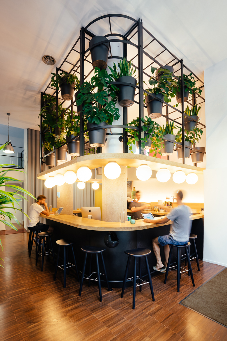 Typeform’s headquarters were to be provided of fresh air and free mobility. The solution came hand in hand with Kamal Meattle, a NASA specialist, according to whom there exists a specific combination of plants capable of renewing interior space’s air. We designed the holding structures and distributed 810 items of these species, as well as a gardener on staff. We paired the idea with a space redistribution around a boulevard where to meet, eat or chill. With the notion of reducing the office to a laptop, Typeform has been designed to have the freedom of choosing where to work, whether at the table, discussing in an agora, lying on the hammocks or having a beer at the bar-reception. In Typeform it is eaten comfortably, it is worked in multiple formats and spaces are merged with working rooms adapting to concrete profiles. It isn’t an office, and if it resembles one, we’ve utterly failed.