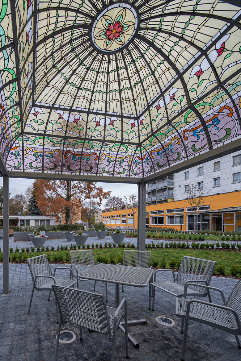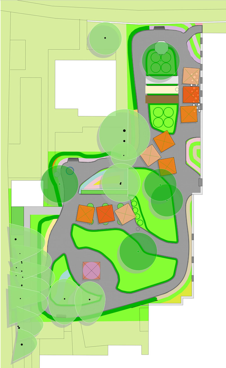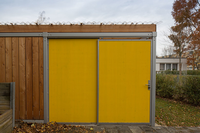 Die kräftigen Farben für die Fassade des angrenzenden Speisesaals, des Geräteschuppens und der Sonnenschirme wurden in Abstimmung mit der Herbstfärbung der bestehenden Zieräpfel gewählt.