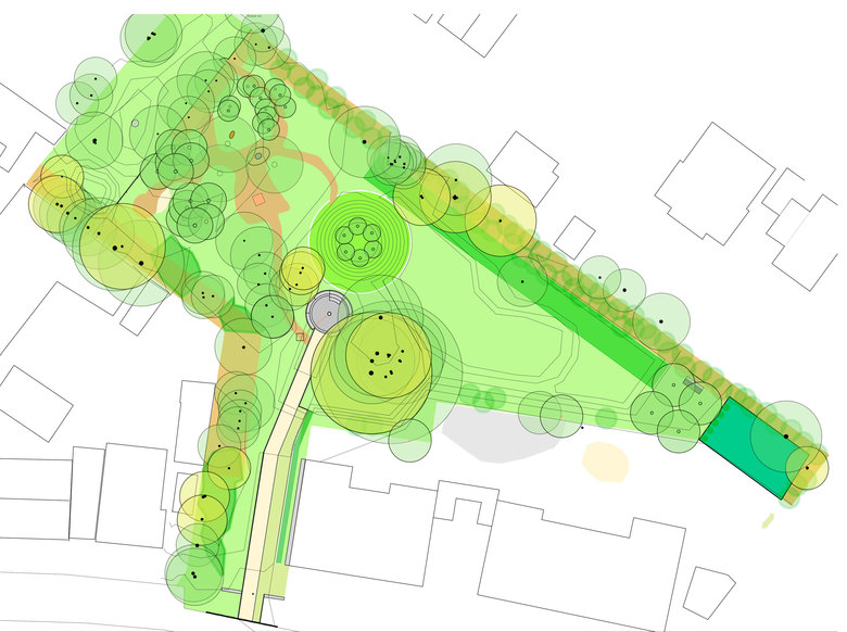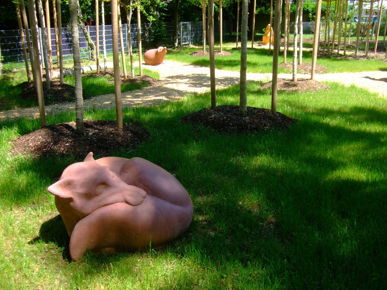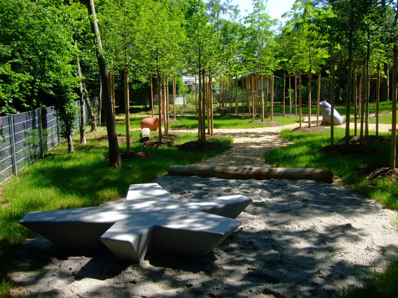 Unter Schonung und Entwicklung des Baumbestandes wird hauptsächlich das Ziel verfolgt hier eine Grünoase für naturnahes Kinderspiel anzulegen. Auf Grundlage der vorhandenen Topografie wurde eine sanfte Modellierung vorgenommen, die zum Tollen und Spielen für kleinere Kinder anregen soll und im Winter bei Schnee rodeln in bescheidenem Rahmen ermöglicht. Neben unterschiedlichen Spielmaterialien wie Sand und Holzhäcksel wurden ein Kletterturm und vier mannshohe Spieltiere aus farbigem Beton aufgestellt: ein schlafender Fuchs, ein schnüffelnder Igel, ein sitzendes Wildschwein und ein Hase, der auf den Hinterläufen steht. Jedes der Tiere, das zu Rollenspiel anregen soll, steht zwischen hainartig gepflanzten unterschiedlichen Kleinbäumen und Großsträuchern. Die Figuren sind Unikate, die speziell für diesen Ort angefertigt wurden.