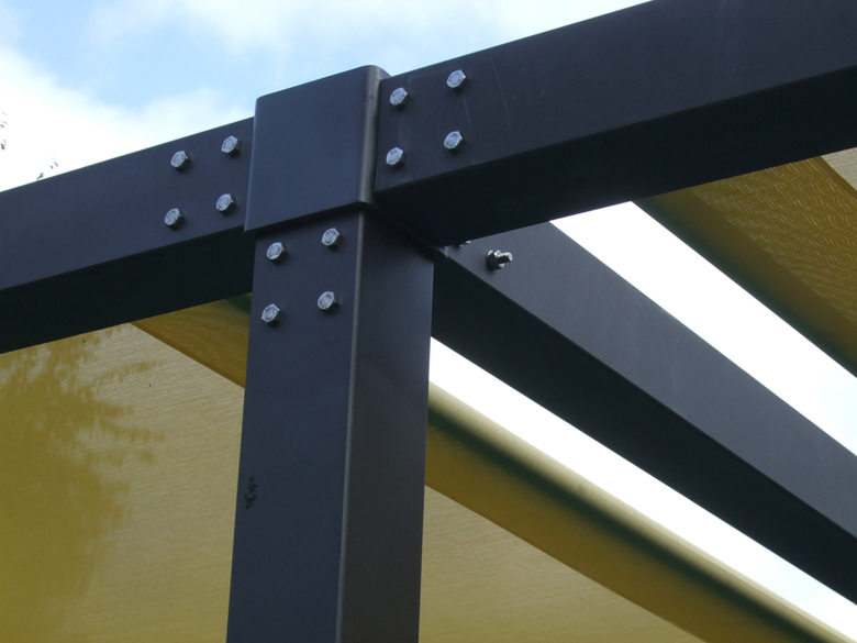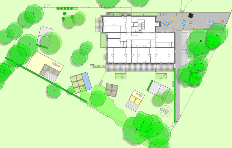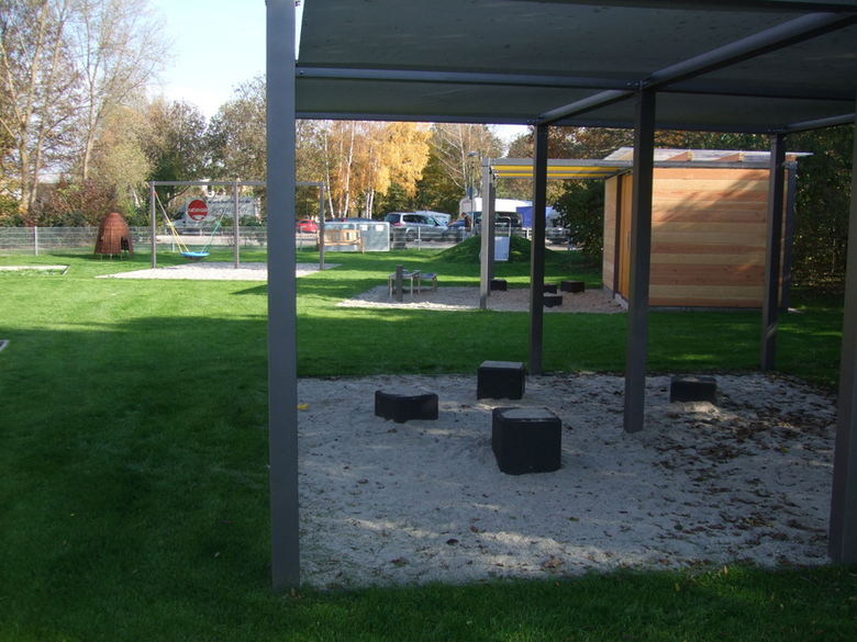 Die reichlich bemessenen Freiflächen wurden mit einem eigens entwickelten System von Spielgeräten bestückt, in die eine Beschattung integriert ist. Mit diesem System wurden auch Gerätehäuschen und der Radlschuppen gebaut. Die Materialität und Farbigkeit lehnt sich an die des Hauptgebäudes an.