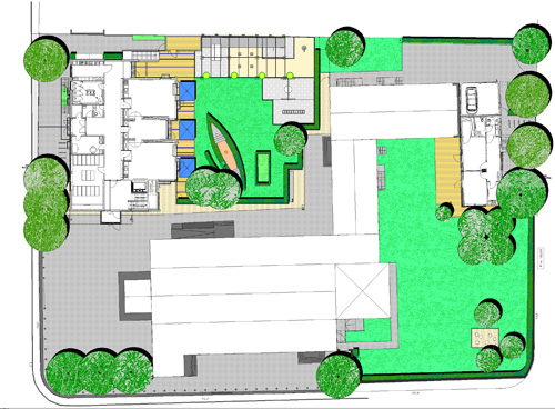 Der zweigruppige Kindergarten "Zu den heiligen 14-Nothelfern" befindet sich im Erdgeschoß des Pfarrheimes. Ihm ist auch der Freibereich zugeordnet, der aus einer großen zentralen Spielwiese und randlich angeordneten Spielgeräten besteht. Eine Spielwand mit Gerätehaus steht direkt an der Grenze zum Nachbarn. Ein Spielschiff mit Heckeneinfassung bietet labyrinthartige Strukturen zum Verstecken. Der neue Seniorenpavillion wurde in den Pfarrgarten integriert. Seine randliche Lage läßt die große Wiesenfläche weitgehend unberührt.
