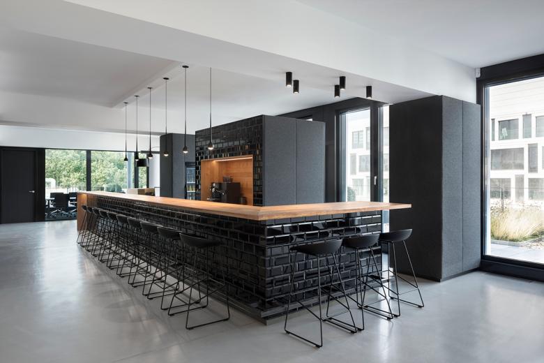 Der repräsentative Eingangsbereich empfängt die Besucher und bietet an einer langen Theke Sitzgelegenheiten und die Möglichkeit, Kaffee und Getränke anzubieten. Intern wird die Theke zur Tafel, wenn sich das Team hier zum gemeinsamen Essen trifft.
