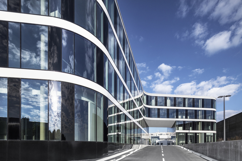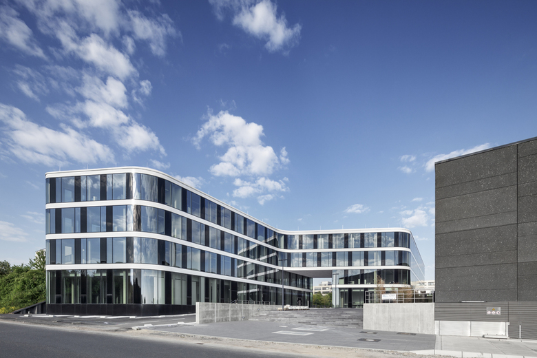 Das Verwaltungsgebäude schiebt sich vor die bestehenden Institute, bildet mit dem Prüfstandsgebäude zur Straße hin eine städtebauliche Figur und damit eine erkennbare Adresse zur Forckenbeckstraße. Der geschwungene Baukörper besitzt ein Maximum an innenräumlicher Flexibilität für die unterschiedlichen, spezifischen Anforderungen (open space, Zweispänner, combi office). Hier befindet sich der Hauptzugang über das Foyer hin zu den Vorlesungs- und Seminarräumen.