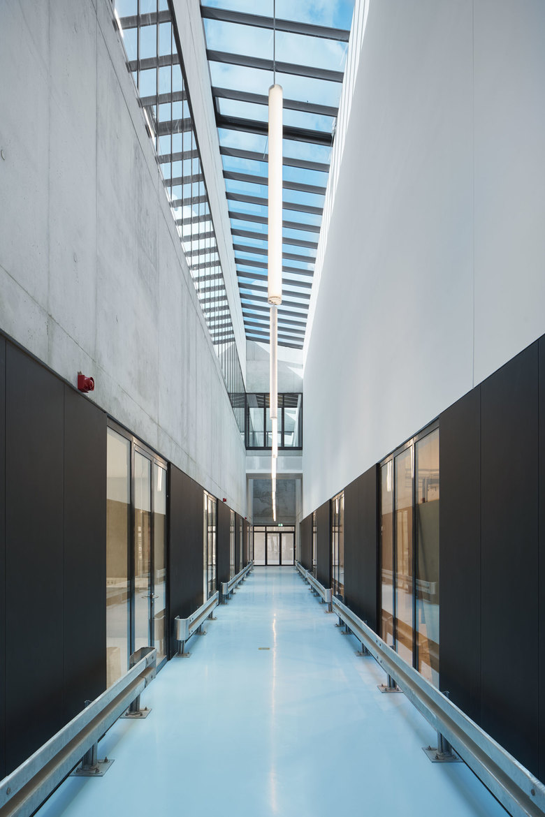 Funktionen - kurze Wege - großzügige Arbeitsfelder – Der Fachbereich wird künftig über einen zentralen Eingang vom neu entstandenen Platz her erschlossen. Aus dem Foyer geht es über eine 3-geschossige Erschließungsfuge zum Neubau und der ehemaligen Laborhalle. Sie dient als Gelenk zwischen Alt- und Neubau, von dem aus alle Arbeitsbereiche zugänglich werden. Die Anlieferung kann sowohl über die Erschließungsfuge, als auch über den Werkhof erfolgen.