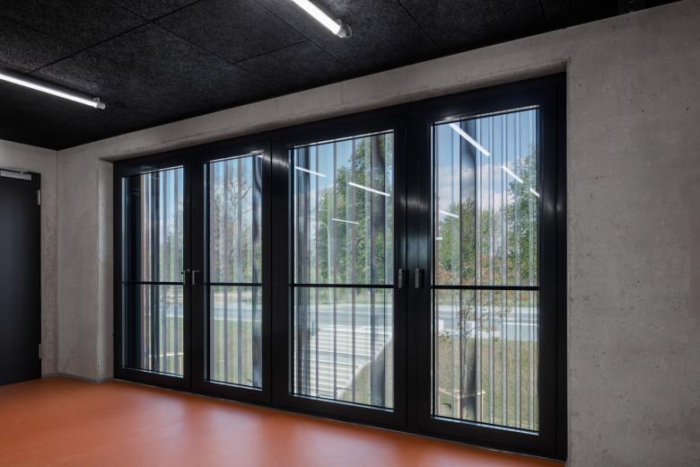 Die Glasfassade im Erdgeschoss bildet ein transluzentes Schaufenster der Feuerwehr Titz mit den hier geparkten Feuerwehrfahrzeugen. Im mittleren Teil des Gebäudes befinden sich die gemeinsamen Umkleiden, Sanitär- und Reinigungsbereiche, sowie die Werkstätten der zwei Abteilungen. Die Büroflächen, Schulungs- und Sozialräume im Obergeschoss können von beiden Parteien genutzt werden. Ein großer Schulungsraum wird durch eine mobile Trennwand entweder gemeinsam oder in zwei kleineren Räumen getrennt genutzt.