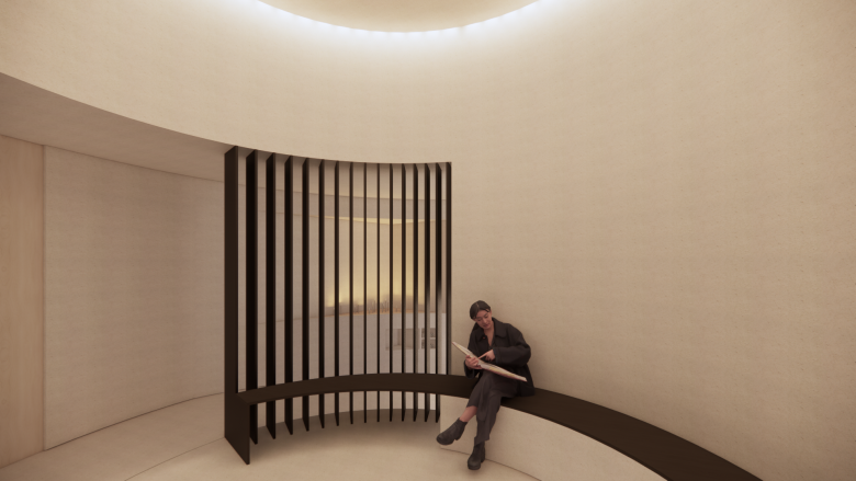 Wie ein Schaufenster öffnet eine großzügige Glasfassade den Pfarrsaal zur Innenstadt und ermöglicht Einblicke in das Gemeindeleben. Der Gebetsraum bildet im Gegenzug einen Ort der Stille und des Rückzugs. Durch die offene Anmutung des Gemeindesaals und die monolithische Gestalt des Gebetsraums schafft der Neubau eine Balance zwischen Öffentlichkeit und Einkehr. Verbunden sind die beiden Räume über einen „Kreuzgang“, an den sich mehrere Nebenräume anschließen. Hierüber wird auch die bestehende Propstei angebunden.