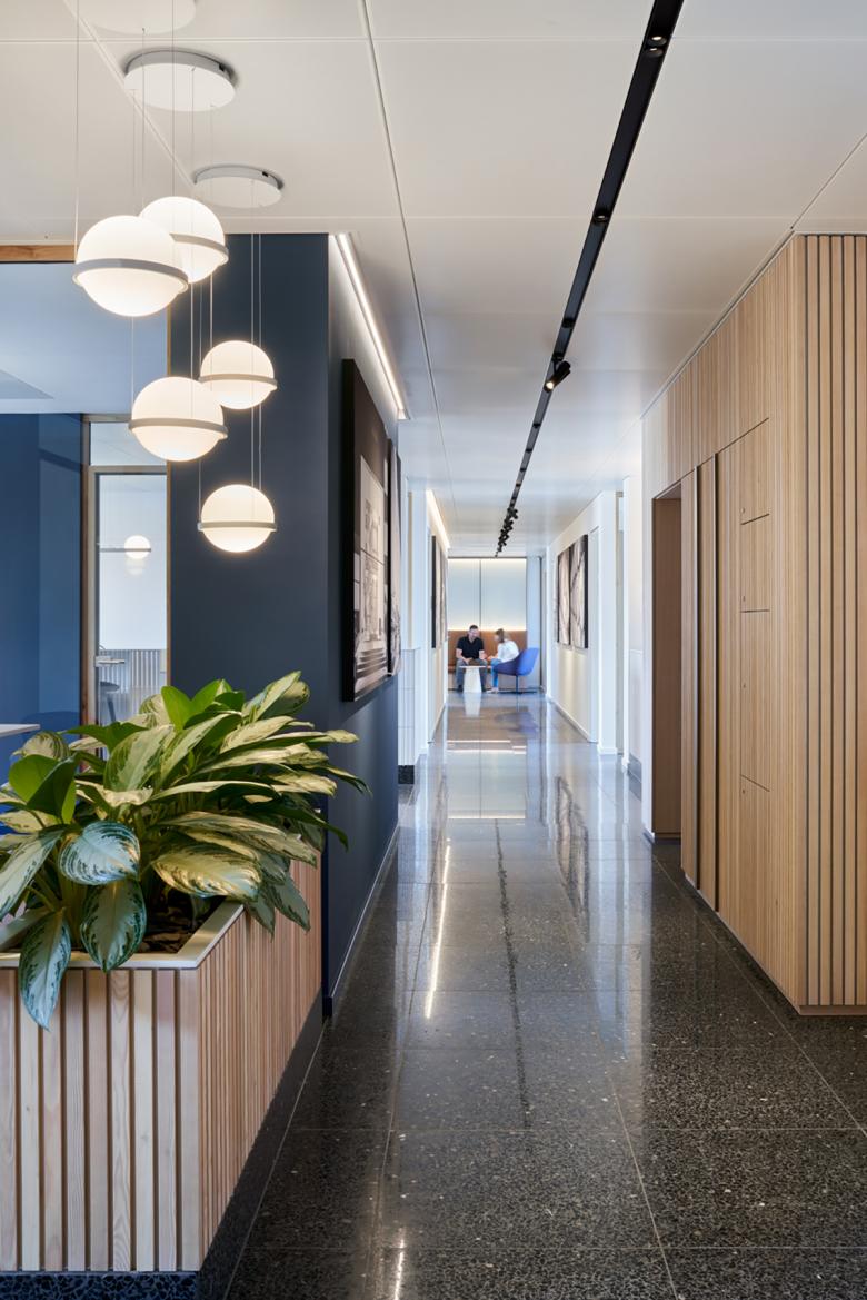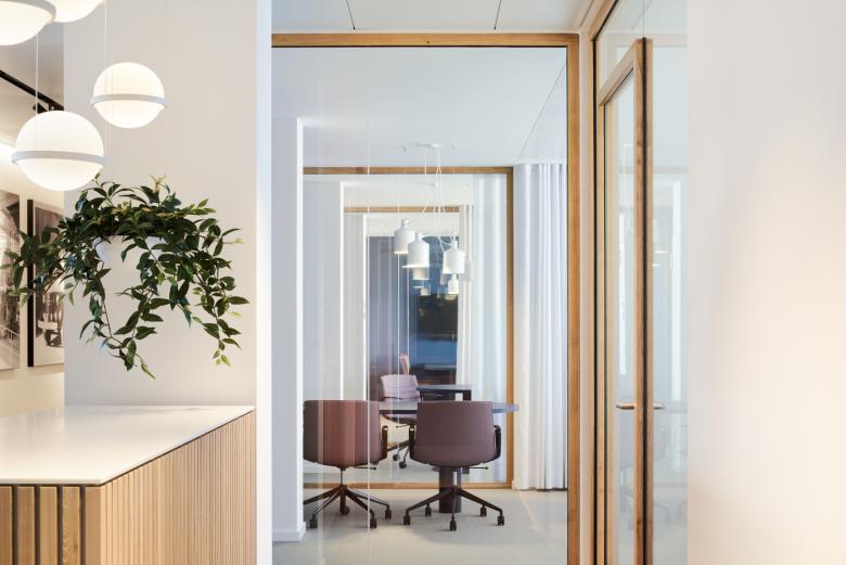 Die Glastrennwände sind dabei ein wichtiges neues Architekturelement. Diese bilden Lichtachsen die mehr Tageslicht in das Gebäudeinnere bringen. Zugleich ermöglichen sie eine Transparenz mit Blickbeziehungen zwischen den einzelnen Büroräumen, aber auch den allgemein genutzten Bereichen. Durch Vorhänge kann individuell Diskretion geschaffen werden.