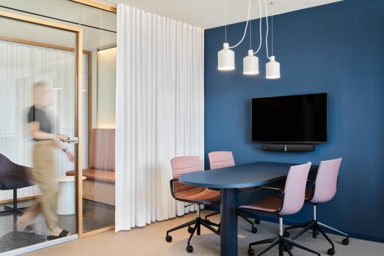 In der Büroetage der Führungskräfte des Unternehmens in Leverkusen wurde die alte Struktur von Einzelbüros mit Vorzimmern aufgelöst. Die Bestandsarchitektur wird freigestellt und die neuen Räumlichkeiten durch verschiedene Raumgrößen zoniert.