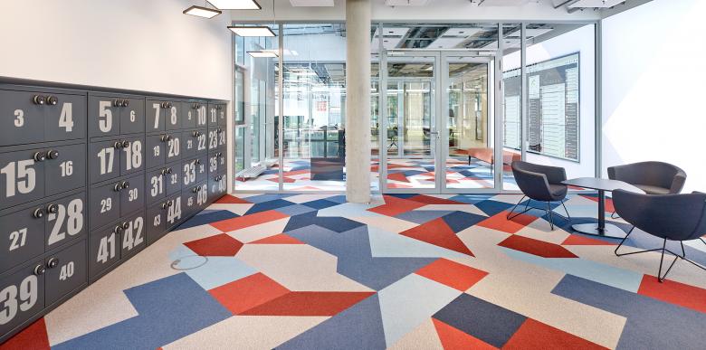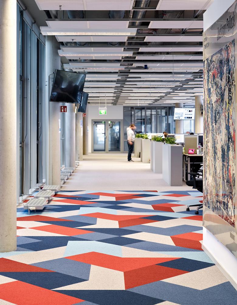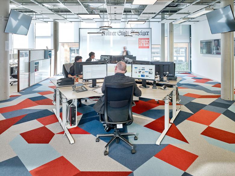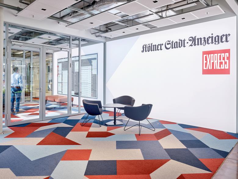 Gemeinsamer Hintergrund für beide Marken des Kölner Stadt-Anzeigers und des EXPRESS ist das Hauptgestaltungselement des Bodens, der die jeweiligen Hausfarben Blau und Rot strahlen lässt. Als verbindende Spange markiert das eigens entwickelte Muster die Zugänge zu den Redaktionsräumen und fasst die Sonderzonen mit Besprechungs- und Interviewräumen sowie Teeküchen zusammen. In abgeschwächter Form flutet die grafische Gestaltung auch Wände und Einbauten. Quadratische Pendelleuchten schaffen eine formale und gestalterische Verbindung zwischen dem Boden und der sichtbar der Technik vorgehaltenen Decke.
