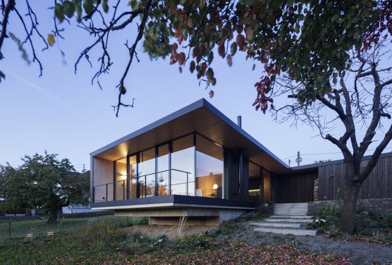 Es hat den Anschein als schwebe das Gebäude dank des geringen Fußabdrucks über dem Hang. So bleibt mehr Platz und differenzierteres Angebot für den naturnahen Garten mit ausschließlich regionalen und bienenfreundlichen Pflanzen.