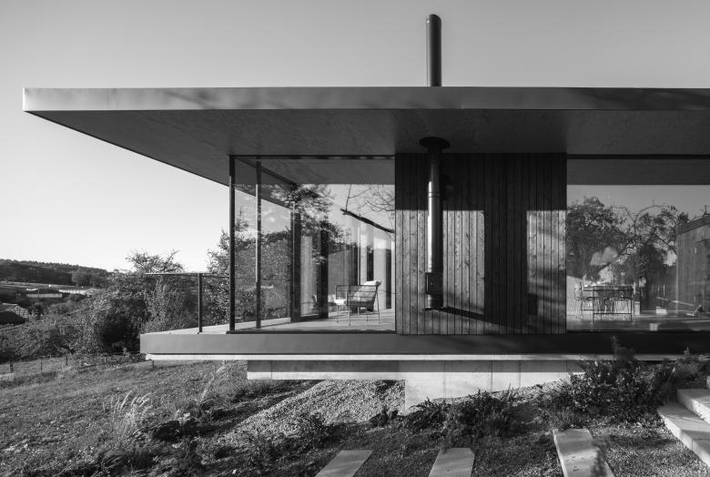 Trotz Hanglage sollte ein eingeschossiger Baukörper entstehen, der sich mit dem Gelände entwickelt, Außen- und Innenraum großzügig verbindet und einen möglichst freien Blick auf die umgebende Natur schafft: Landschaft als Hauptdarsteller.
