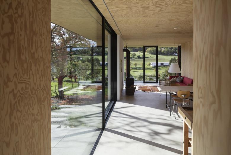 Der Wohnraum umfasst alle wesentlichen Bereiche des einfachen Lebens. Küche, Tisch, Kamin. Kleine Räume als Schlafraum, Studio und Bad können durch Schiebewände zugeschaltet werden. Auf Flure wird verzichtet.