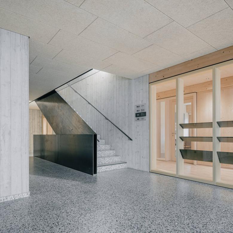 Über einen Vorplatz kommend, betritt man das Gebäude und gelangt in ein Foyer, welches mit zentralem Erschließungskern in öffentliche und halböffentliche Funktionen verteilt. Von hieraus gelangt man direkt in die Büros der Landwirtschaftskammer und des Maschinenrings welche sich über die ersten zwei Geschosse verteilen, sowie in den Veranstaltungssaal und in die Wohnung im obersten Stockwerk. Sämtliche Räume öffnen sich dabei direkt auf die vorgelagerten, gedeckten Terrassenbereiche (Veranda) und bieten so neben räumliche Erweiterungen mit hoher Aufenthaltsqualität für die Mitarbeiterinnen auch attraktive Blickbeziehungen ins Umfeld.